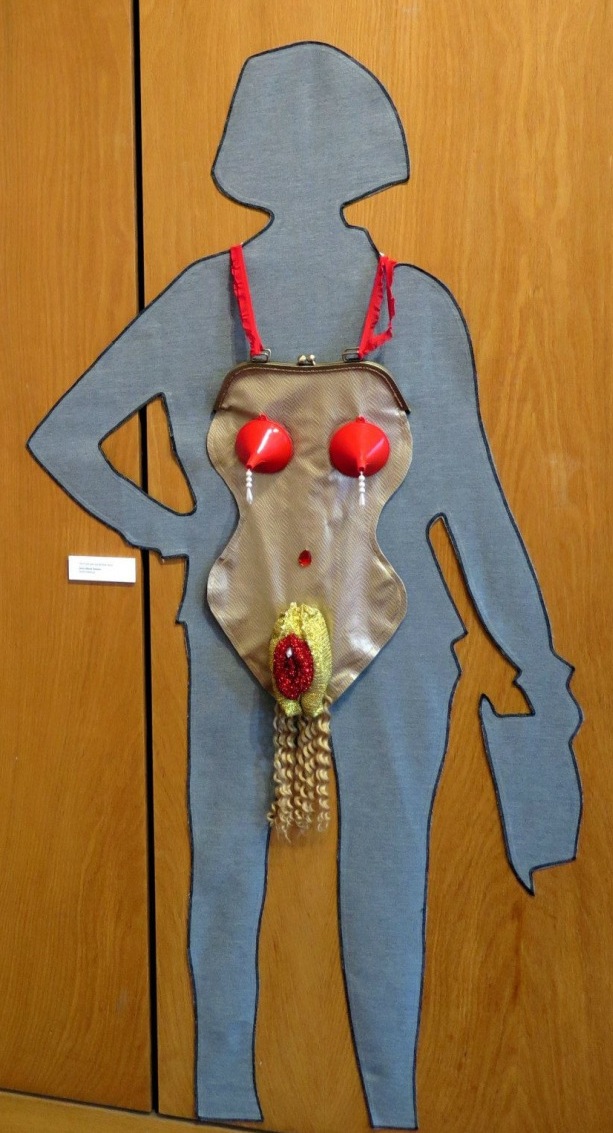 The artist jeweller Ramón Puig Cuyás posing with my Body Bag III “Ceci n´est pas une pute”/ “This is not a Tart” (2015). Photo by Silvia Walz at the exhibition “En Tránsito” at the Cervantes Institute, Munich.