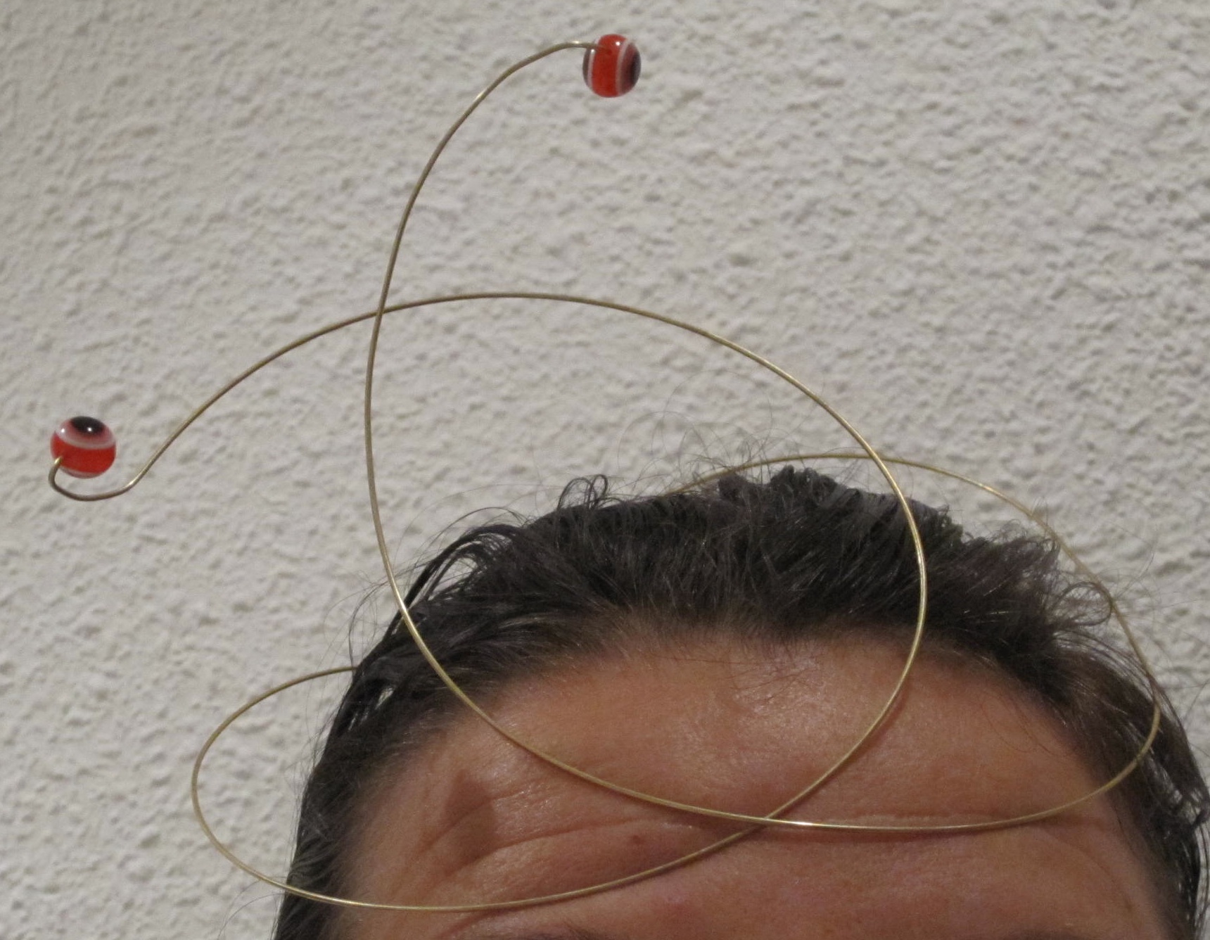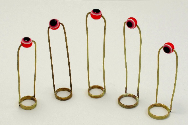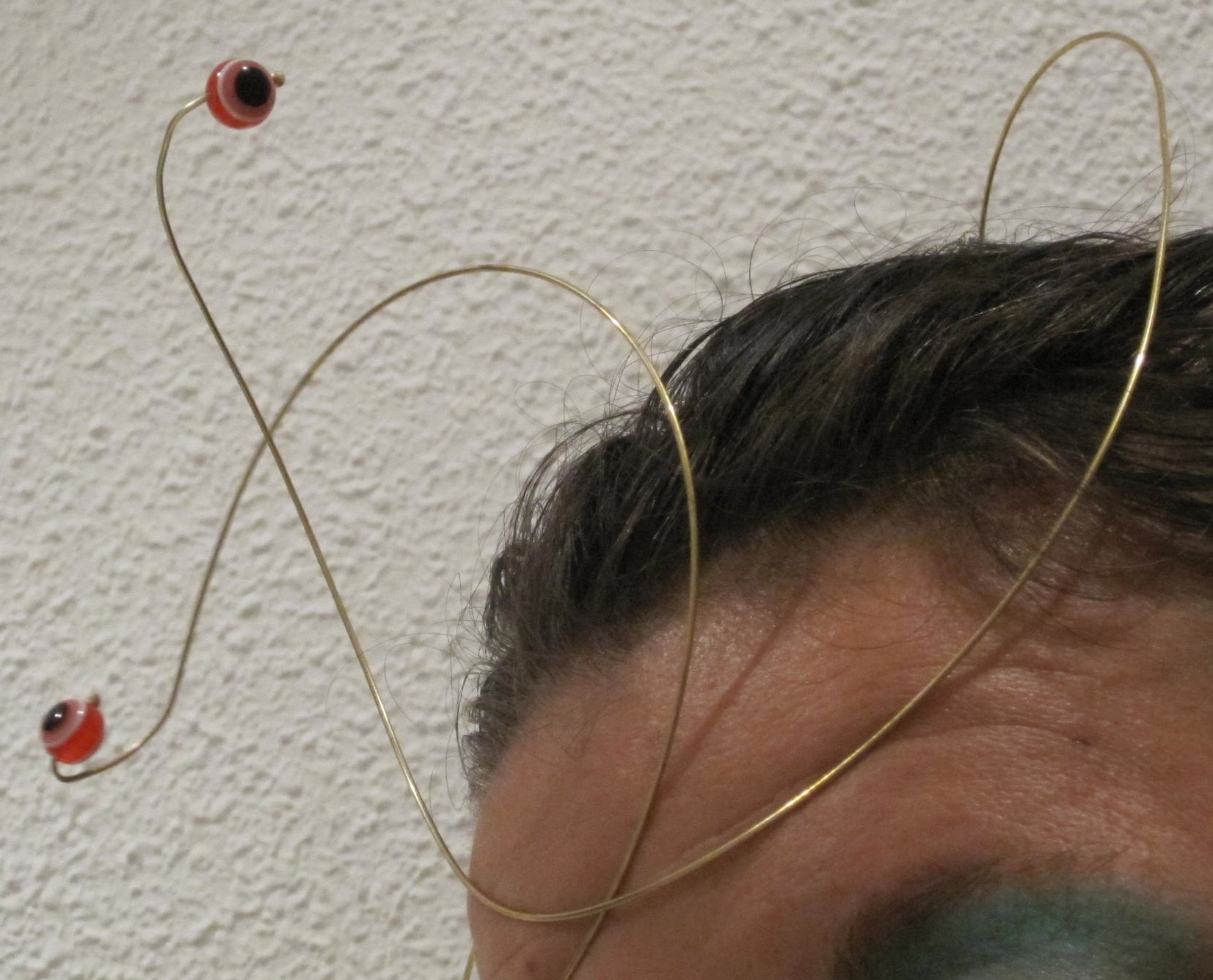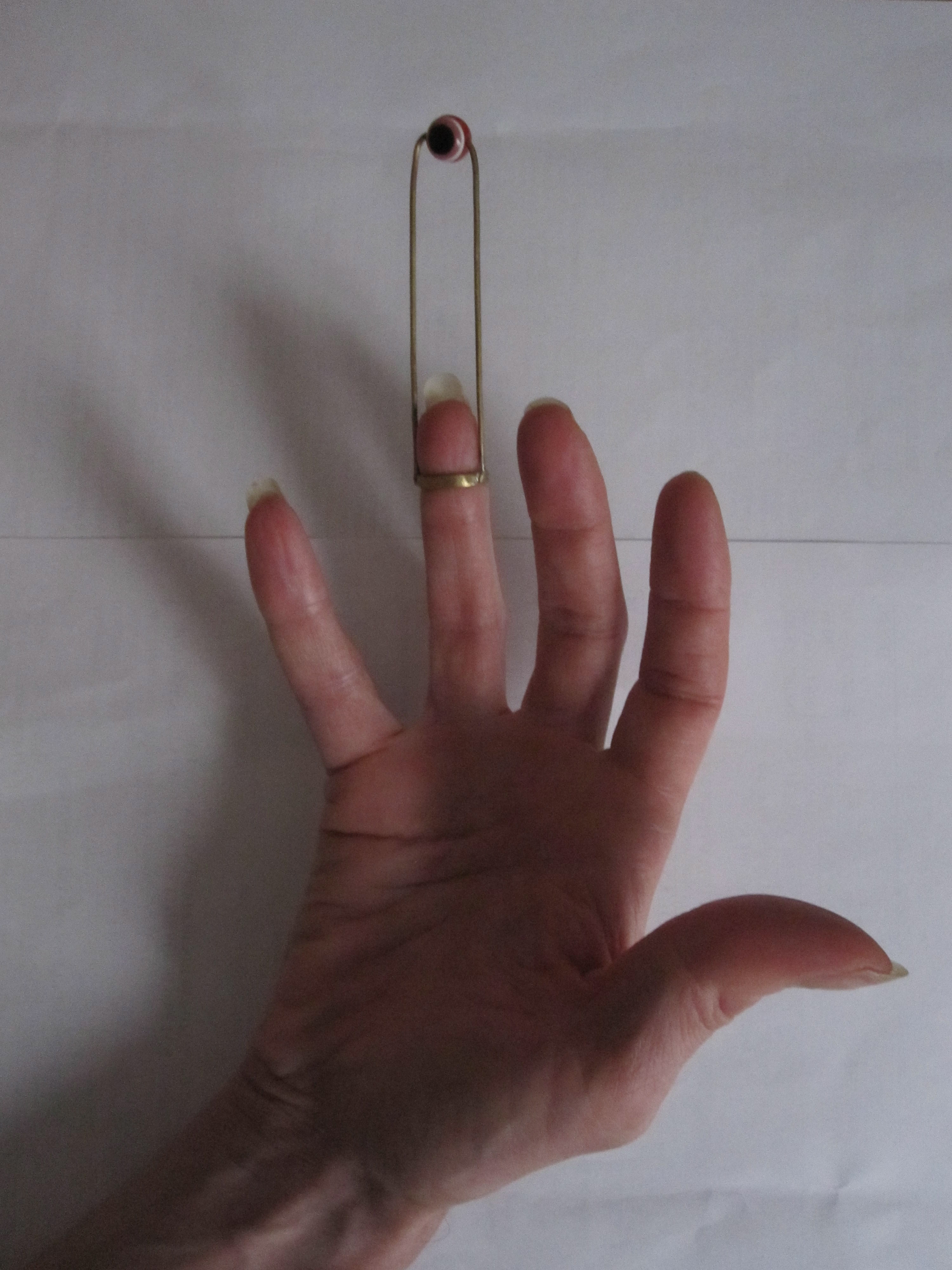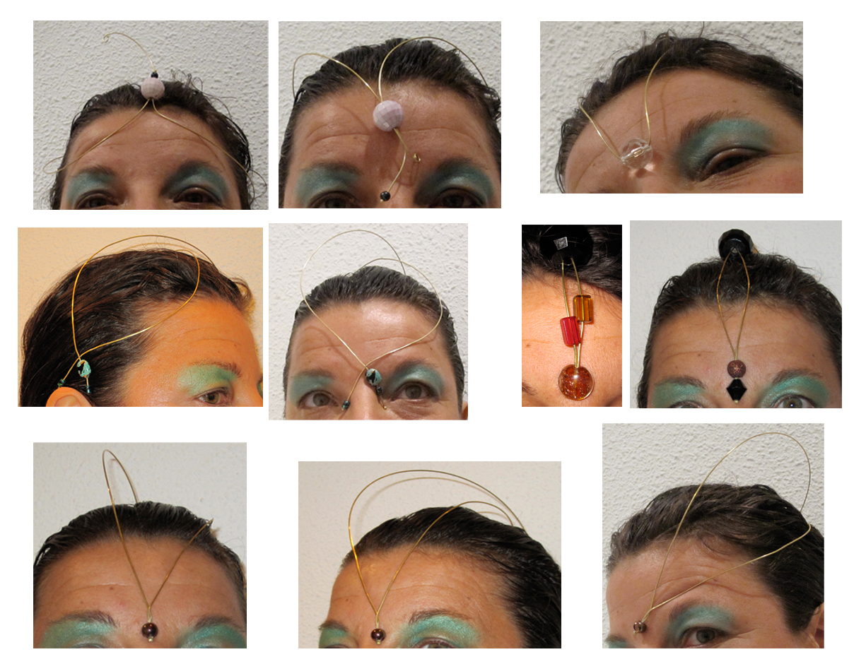 Eran de color cobre oscuro, deformadas y asimétricas, en estilo “Steam Punk”, como objetos mágicos con poderes secretos, de origen desconocido, sin edad. Hice varias pruebas para decidir la forma y estructura del anillo y la pieza final es de latón y más linear y simétrica. La sensación de llevar las extensiones de dedos y el sonido que los ojos hacen cuando chocan es muy particular.